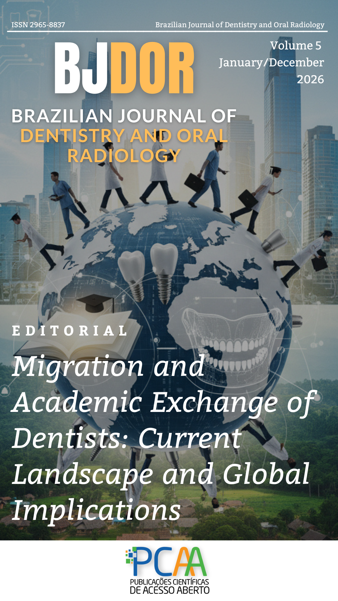 This cover page represents the editorial titled Migration and Academic Exchange of Dentists: Current Landscape and Global Implications”, which explores the growing phenomenon of professional and academic mobility among dentists worldwide. The article discusses how migration is driven by professional, economic, and academic motivations, fostering scientific development and cross-cultural learning, while also generating challenges such as diploma validation, cultural adaptation, and ethical considerations. It highlights the role of academic exchange programs in strengthening international collaboration and professional training, as well as the importance of initiatives, such as preparatory courses for international licensing exams, that promote equitable access to opportunities abroad. The editorial also emphasizes the need for global policies that ensure ethical and sustainable mobility, in line with recommendations from the World Health Organization and the FDI World Dental Federation. Ultimately, the piece advocates for a balanced approach to professional migration, one that transforms mobility into an opportunity for growth while reinforcing local oral health systems and global cooperation.